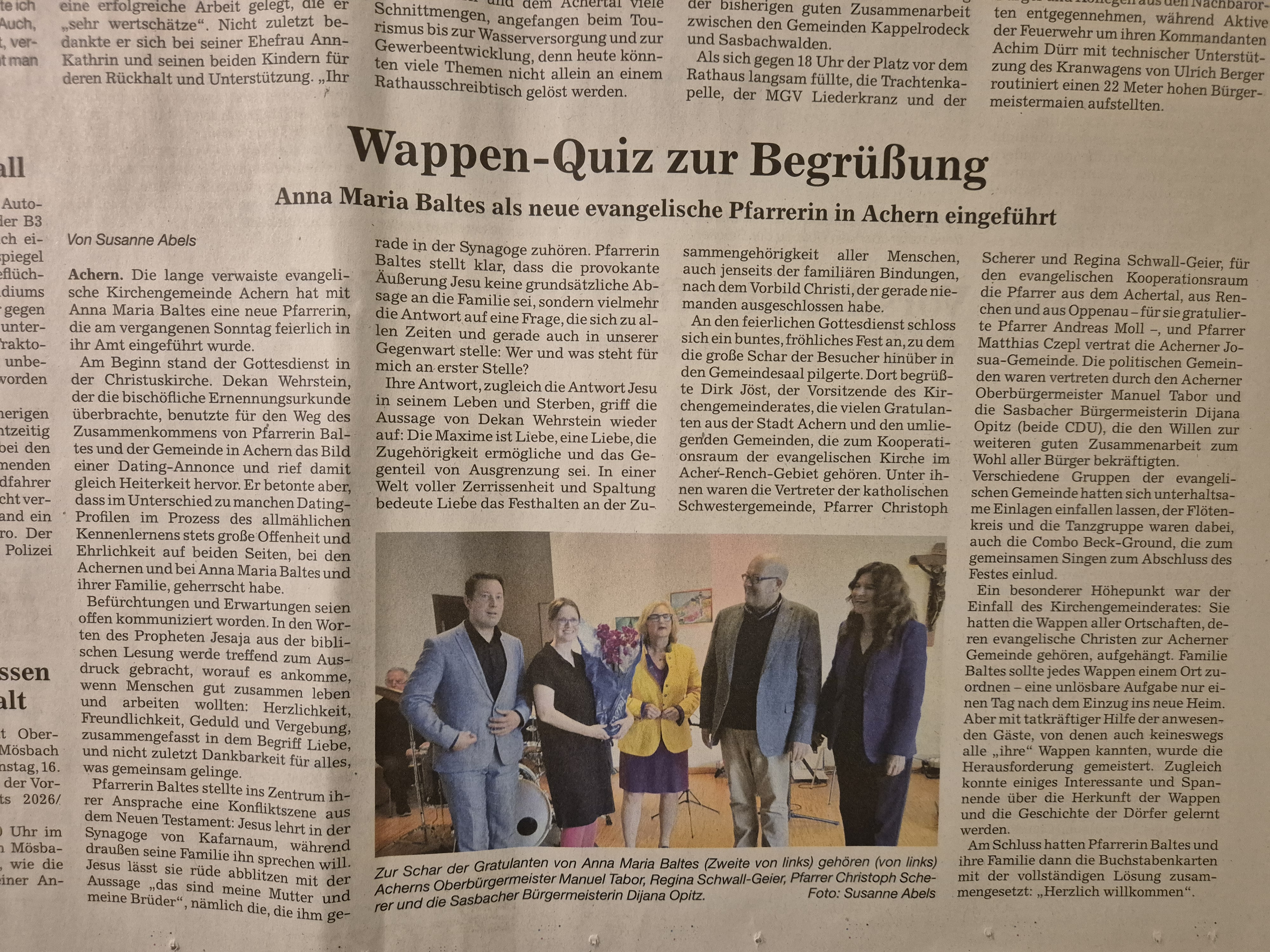 In einem feierlichen Gottesdienst am Sonntag, 14.09.2025 wurde Anna Maria Baltes in ihr Amt als Pfarrerin der Evangelischen Kirchengemeinde Achern eingeführt. Oliver Wehrstein, Dekan des Evangelischen Kirchenbezirks Ortenau, verlas die bischöfliche Ernennungsurkunde. Nach der Einführung und Segnung übernahm dann Anna Maria Baltes die Leitung des Gottesdienstes.