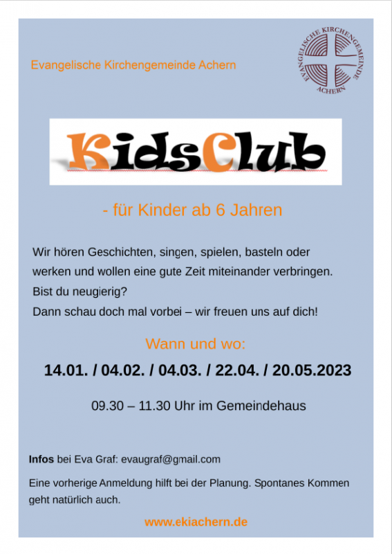 Wir treffen uns einmal im Monat samstags zum KidsClub im Gemeindehaus: wir singen, spielen, hören Geschichten, basteln und werken und wollen eine gute Zeit miteinander verbringen. Nächstes Treffen ist am 04.03.2023 von 9.30 - 11.30 Uhr.